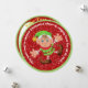 Cute Elf Round Christmas Flat Card. Cute Elf on Metallic Green and Red Glitter Look Background Round Christmas Flat Card. Photo and Text Editable Card.