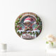 This charming clock features a cute elf with large pointed ears and a striped hat, peeking out from a snowy round window set into a rustic wooden wall. The window is framed by a generous wreath of pine boughs, holly, and red ornaments, with a sign below reading "Merry Christmas." The design may look real due to the high detail and three-dimensional texture in the artwork.