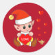 Cute love elf with magic lamp and hearts on red background Thank You Stickers. Text can be personalised for any event!