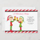 This is an adorable Christmas party invitation. It has a red and white striped background. Then there's a black thin border with a white centre. There's this cute girl elf holding up presents. Next to her is this a cute boy elf doing the same thing. The elves are dressed in red and green wearing santa hats. Personalise with party information next to them. Check out the many other designs and products we have in Christmas invitations. © JW Illustrations