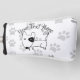 Cute little English Bull Terrier, white with black eye patch, over a background of grayscale paw prints...classical!