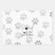 Cute little English Bull Terrier, white with black eye patch, over a background of grayscale paw prints...classical!