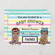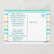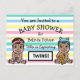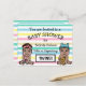Here are cute hand drawn baby boy and boy and girl twins Baby Shower invitations. Personalise these by adding your party's information in the personalise area. Pink, blue, green, purple and tan stripes in the background with a cute boy and girl baby twin in each corner. These postcard invitations are a very affordable way to get pre made personalised baby shower invitations. These babies represent African-American babies.