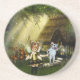 A Fantasy themed design with a little fairy and her white mouse friend featuring a backdrop of mushrooms green grass and beaming light sky.