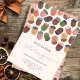 Beautiful fall-themed first birthday party invitation templates ready for you to customise! Falling from the upper edge of this design, there are hand-painted acorns in beautiful shades of pink, brown and green decorated with simple decorative design. Feel free to contact me with any design-related questions!. Original artwork by Caroline Bonne Müller