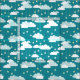 A cute pattern of little yellow stars falling from light grey and blue fluffy clouds. The yellow stars are attached to a yellow dotted line, and look almost like they are hanging from the clouds. This night sky scene is a lovely pattern for children.