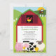 This 5x7 cute boy's farm birthday party invite has a tractor in the background with a barn and some farm animals including a pig, cow, a sheep, a baby chick, and a rooster. You can easily customise your party information in the middle. Graphics by BabyStar Design at MyGrafico.com