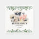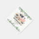 Cute kids farmyard birthday party napkins featuring a simple white background, elegant eucalyptus foliage, adorable watercolor farm animals including a cow, pig, sheep, dog, chicken, rabbit, duck & a rooster, and a text template that is easy to customise.