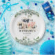 Cute kids farmyard birthday party plates featuring a simple white background, elegant eucalyptus foliage, adorable watercolor farm animals including a cow, pig, sheep, dog, chicken, rabbit, duck & a rooster, and a text template that is easy to customise.