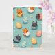 This card features a repeating pattern on a soft aqua background, filled with stylized cats peeking out from cracked decorative ovals as if they’re shyly greeting one another. Some cats are striped orange and others are charcoal gray, with closed eyes and small smiles that suggest a tender, friendly calm. Between them sit smooth, uncracked oval shapes decorated with stripes, polka dots, and tiny hearts, creating little moments that feel like quiet affection. The colors stay gentle and pastel—soft coral, muted blue, creamy white, and warm yellow—so the whole scene feels light and airy, with a subtle romantic softness in the way the faces seem to “lean” into the pattern. Small star shapes sprinkled around in white and blush pink add extra sparkle across the background, alongside a small touch of spring flair 🌷. There’s no main character or single scene; instead, the repeating layout makes it feel like an ongoing exchange of sweet glances, like friends sharing a private joke. No text appears on the front, leaving the aqua space and the pastel ovals to carry the design 🐇, and the tiny stars dot the gaps between the ovals in a scattered, even rhythm.