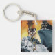 Two ferrets stealing a set of keys on top of a stonecherub.