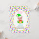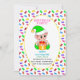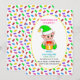 Cute first baby Birthday and baby elf with multicolored sweets on white background Party Invitation.