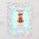 Cute first Birthday pastel multicolored balloons on turquoise Invitation. Texts and numbers ready to be personalised for all kid ages!