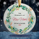 Cute first Christmas in our new home wreath ceramic ornament. Celebrate your first Christmas in your new beautiful home with a cute custom holiday ornament featuring a beautiful wreath and modern typography. Personalise it by changing the year and your family name.