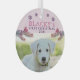 Cute first Christmas puppy photo ornament with Christmas tree branches and snowflakes on pink background. Personalise the ornament with your dog`s photo, name and year of birth - insert your favourite puppy photo. You can use this custom ornament for any pet. A sweet holiday keepsake for you or a gift for your family and friends.
