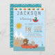 Fishing birthday party invitations with cute woodland bear and rabbit fishing in a boat on a mountain lake background on the front and water design on the back. These any number fishing birthday party invitations are easily customised for your event by simply adding your details. You can also change the background colour on this adorable fishing birthday party invitations.