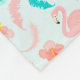 What a cute fleece blanket for a newborn, toddler, or small child! It features a pink flamingo mum and baby at the centre of a turquoise blue and pink lined ornate white banner. Below the image of the two birds is your child's name in matching teal. The banner with the image and text is placed on a pretty background of matching tropical images, including another flamingo, hibiscus flowers, and leaves. In pastel colours, this is a very pretty gift idea, too.