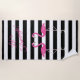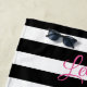 This tropical striped black and white beach towel is accented with two cute pink flamingos, and Let's Flamingle, written in bright pink, making it perfect for your next pool party or day at the beach!