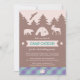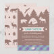 Cute girls camping themed birthday party invitations. Featuring purple and teal paid with soft pink and kraft textured brown, with woods, a tent, a moose, and a bear.