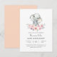 An adorable baby shower design featuring an elephant framed by a floral bouquet. Your custom shower details appear below in a cute, modern typography. These cards reverse to a pastel pink colour with a charming white pattern.