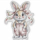 A cute cartoon illustration of a bunny wearing a pink and mint green floral headscarf with a bow. The bunny has long, upright ears, large expressive black eyes, and a happy smiling expression. It is wearing a pink and mint green long-sleeved outfit with a lace-trimmed collar and decorative buttons down the front. The bunny's outfit includes a pair of pink overalls with front pockets and ruffled details. The bunny is standing upright in a friendly pose with its hands at its sides. The illustration has clean lines and a soft, watercolor-style finish. The bunny's fur is rendered in light beige and white tones, with subtle shading to create depth and dimension. The overall composition is centered on a white background, creating a sweet, childlike illustration style.