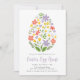Cute Easter egg hunt invitations featuring an illustration of purple, yellow, red, and orange spring flowers and greenery arranged in the shape of an egg. Personalise the floral Easter invitations with your Easter egg hunt details shown below.