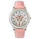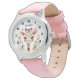 Here's an adorable wrist watch for a child, especially if he or she is learning to tell time. The centre features a cute happy giraffe surrounded with colourful flowers. Above the image is your child's name. The black numbers make the watch easy to see and read. Everything is placed on a white background.