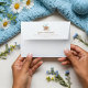 This adorable envelope features our hand-painted floral woodland knitted bear design, combining whimsy and warmth with hand-painted watercolor artwork. A sweet bear standing on a tree stump holding a daisy with a bee, surrounded by beautiful florals. The unique knitted texture adds a cosy, handcrafted touch. On tenvelope flap, you’ll find a serene woodland scene with a wooden tree stump adorned with florals and a perched bird, creating a tranquil vibe. A personalised monogram on the bear's belly adds a custom element, making each envelope truly unique. This envelope is the perfect complement to our baby shower invitation, adding a soft, rustic charm to your celebration. Hand-drawn artwork and design by © Moodthology Papery.
