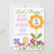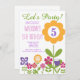 Cute Flower Garden Birthday Party Invitations with fun flowers for a girls birthday party or use as garden party invitations. It has a variety of colourful floral designs growing from the bottom of the invite with pink, purple, red, green, and orange yellow. Add your child's age inside the sunflower. Just add your own party details to this cool and colourful birthday party invitation.