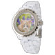 A lovely kitten on a rock in a flowery garden. A cute young redtabby baby cat with wonderful blue eyes, photo taken by Katho Menden. This rhinestone watch for women with dial-plate is a gift idea for cat and pet lovers. http://www.zazzle.com/kathom_photo
