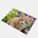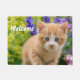 A lovely kitten on a rock in a flowery garden. A cute young redtabby baby cat with wonderful blue eyes, photo taken by Katho Menden. This doormat Welcome is a gift idea for cat and pet lovers. http://www.zazzle.com/kathom_photo