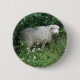 This cute button features a photograph of a cute fluffy sheep. The sheep is surrounded by wild flowers and long grass and is eating some leaves. It has a thick white coat of wool and a cute black nose.