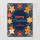 Step into a world of whimsical holiday cheer with this delightful Christmas postcard. The deep midnight blue background sets the stage for a lively border of festive foliage, sprinkled with tiny red berries and charming leaves. At the heart of the design are four delightful gingerbread friends: two cheerful gingerbread men and two intricately designed gingerbread snowflakes, all framed by a classic red and white bauble. The front of this postcard is your personal canvas, allowing you to customise the "Merry Christmas" message and the family name below. On the back, you can add your family's address and a heartfelt note, making this a truly personal way to send holiday warmth to loved ones.