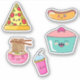 5 die cut stickers featuring Kawaii style pizza, hot dog, cup cake, ramen noodles, and a drink. Each image peels off separately. Great for doodle journals, scrapbooking, and restaurant marketing.
