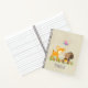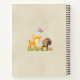 Spiral notebook with a cute illustration featuring a baby deer and a little squirrel holding an acorn and a butterfly flying above their heads. These adorable woodland creatures on standing on some grass with some whimsical mushrooms by their feet. Soft brown background.