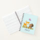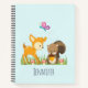 Spiral notebook with a cute illustration featuring a baby deer and a little squirrel holding an acorn and a butterfly flying above their heads. These adorable woodland creatures on standing on some grass with some whimsical mushrooms by their feet.   Light blue background.