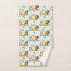 Bath towels with a cute illustration featuring a baby deer and a little squirrel holding an acorn and a butterfly flying above their heads. These adorable woodland creatures on standing on some grass with some whimsical mushrooms by their feet. Light blue background.