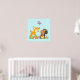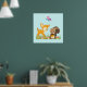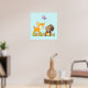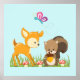 A poster with a cute illustration featuring a baby deer and a little squirrel holding an acorn and a butterfly flying above their heads. These adorable woodland creatures on standing on some grass with some whimsical mushrooms by their feet. Light blue background.