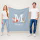Cute blue fleece blanket featuring a woodland forest baby fox cub and bunny rabbit sitting either side of the monogram and name. Designed by Thisisnotme©