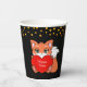 Cute happy baby Fox with pink heart and golden confetti on black. Text can be personalised.