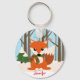 This keychain has a vector illustration showing a cute fox in a snowy winter forest. The fox is wearing a red and green seasonal scarf. The name on the keychain is a template object and can be changed into any other name or text easily.