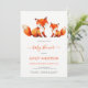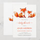 In the upper part, above the text, there are 2 cute red foxes, the bigger mama fox and the smaller baby fox pup, painted in watercolor. Under them there is the text: the words "baby shower" and are written in a red handwriting script, the name and the date / time in red caps, the rest in smaller black caps.