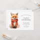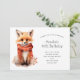 Birthday invitation with an illustration of a reddish orange fox pup. A subtle smile on his face. Wearing a nice red scarf for warmth.