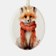 Ornament with an illustration of a reddish orange fox pup. A subtle smile on his face. Wearing a nice red scarf for warmth.