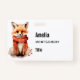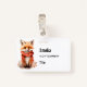 Name badge with an illustration of a reddish orange fox pup. A subtle smile on his face. Wearing a nice red scarf for warmth.