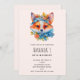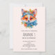 A birthday invitation with an illustration of an adorable fox portrait with a blue and orange floral crown and collar.