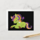 A postcard with an image of a Frankenstein unicorn. Purple and green colours. Spooky cute.