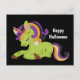 A postcard with an image of a Frankenstein unicorn. Purple and green colours. Spooky cute.