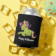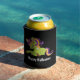 Happy Halloween can cooler with an image of a Frankenstein style unicorn. Purple and green colours. Spooky cute.