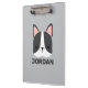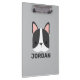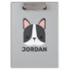 This design features cute French bulldog cartoon illustration with personalised name in grey modern sans serif font style on light grey background.